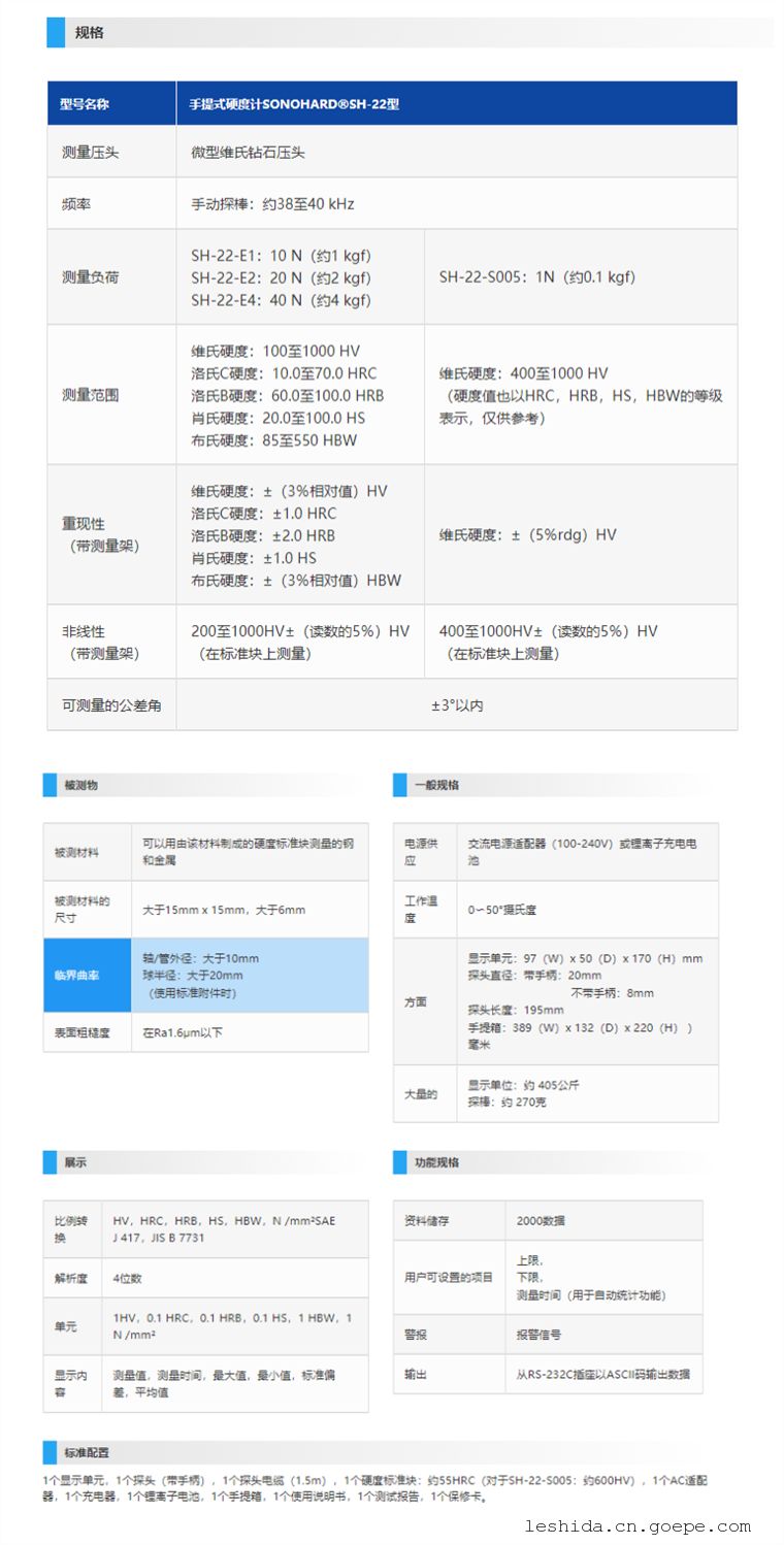 手动探针特别型号SH-21-E4 测量范围 1.洛氏硬度值 HRC 10-70 2.维氏硬度值 HV 50-999 3.肖氏硬度值 HS20.0-99.9 4.布氏硬度值 HB 85-550 重复精度 HRC:±1.0HRC,HV:±(3%rdg)HV,HS:±1.0HS,HB:±(3%rdg)HB 可用测试材料 原则上以钢为准,如果有标准的硬度测试块校正,也可测量其它的金属 测量值显示 4位数字LCD显示,带EL背灯 数值记忆 2000个 显示单位 1HV,0.1HRC,0.1HS,1HB,1N/m㎡(张力) 输 出 RS-232C接口 操作环境温度 0-50℃ 电 源 AC适配器(100-240V)或锂离子可充式电池 连续操作时长 5小时(有背光),8小时(无背光) 尺 寸 显示部分:170(长)×97(宽)×50(高) 探针直径:40mm,长度:164mm 重 量 显示部分:约400g(包括电池) 探针和连接线:约400g
